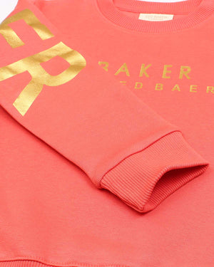 Bright and comfy sweatshirt and jogger set for kids, perfect for everyday wear. This vibrant coral outfit features a soft crewneck sweatshirt with a bold “BAKER BY TED BAKER” print on the front, paired with matching joggers that have an elastic waistband and drawstring for a secure fit. Made from soft, breathable fabric to keep kids cozy and active all day long. Ideal for school, playtime, or casual outings.
