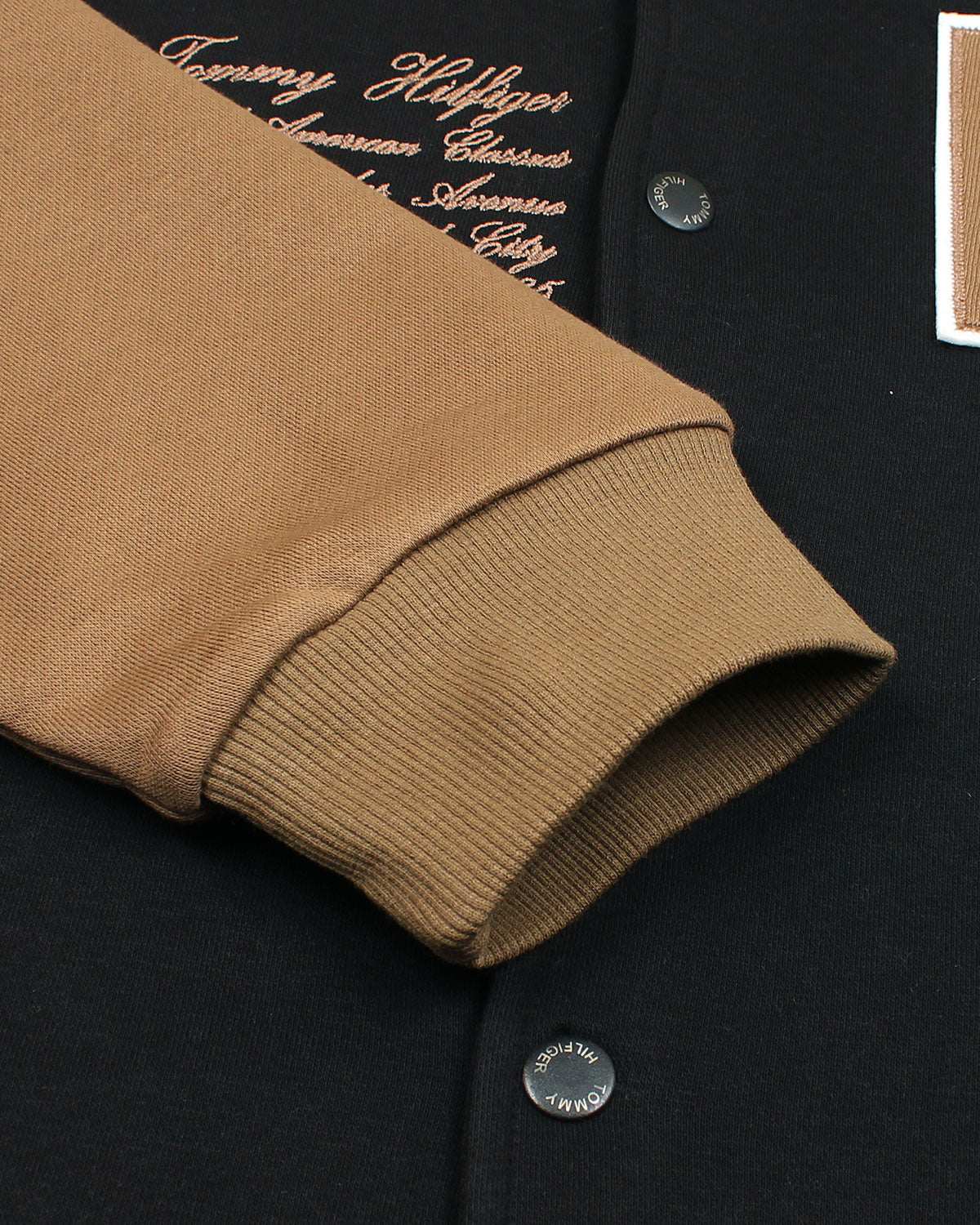 Two-tone design with black body and tan sleeves for a bold varsity look